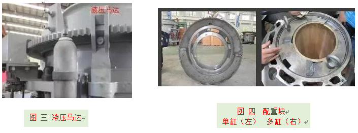 | 排料口调节装置 | 通过油泵对主轴油缸注油或排油,使主轴上移或下移,调节排料口大小。这种调整方式可能引起排矿口在破碎硬矿石时较难锁紧 | 通过液压推手或液压马达,调整调整帽,从而带动调整环在支撑套内旋转(定锥螺旋转动上下移动),达到调整作用。这种调节方式的好处是排矿口容易锁紧。 | 图三 |